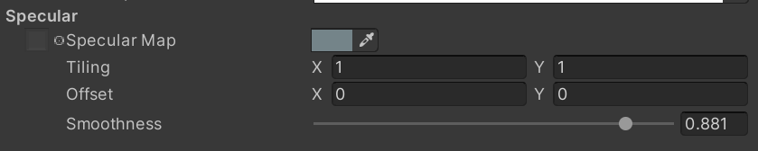 Here is where you can alter the reflection and shininess of your liquid. A specular map and color controls the tint and strength of the reflection. Smoothness determines if the surface is rough/matte or smooth/polished.