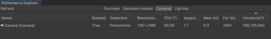The Camera tab gives you insight on any cameras present in your room. It tells you if a camera is enabled, what type of projection it has, its resolution, Field Of View angle, aspect, near/far values and its volume. Because a Camera adds an additional set of rendering that must be done, Cameras can cause performance issues in rooms that utilize them. It’s recommended to have as few cameras as possible, have only one camera render texture active at a time for the local player, and to keep resolution and volume minimal..Settings for the Camera can be changed by selecting the Camera in the Hierarchy and making adjustments in the Inspector window for that Camera. https://docs.unity3d.com/Manual/class-Camera.html