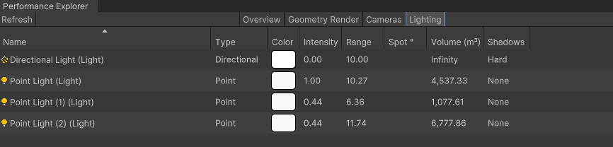 The Lighting tab will help you find all lights in your room, their type, color, intensity, range, spot angle, volume and shadow setting. Lights can impact performance in many ways. To optimize, it’s recommended to put less than 4 lights covering the same area at once, this includes the Directional Light. You can change a light’s color from this explorer as well by selecting the color.