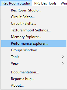 Find and open the Performance Explorer by heading to the Rec Room Studio tab located at the top bar.